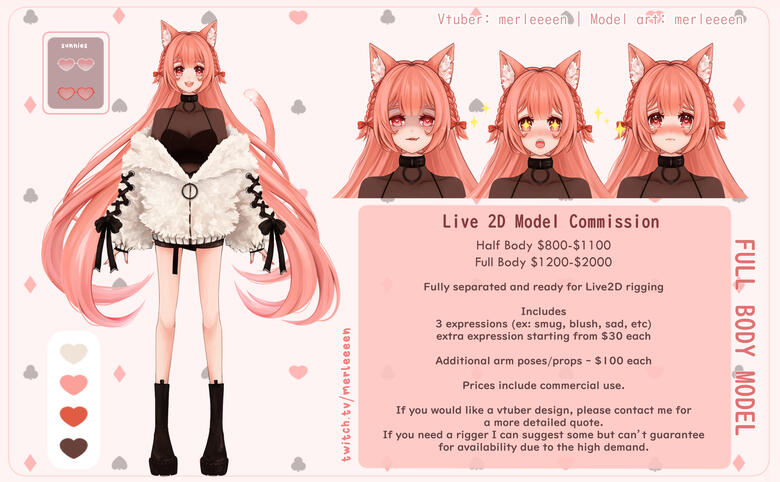 Prices: USDPayment: Pay-pal Invoice / KO-FITOS (Terms of Service)I will start the process of commissions after full-payment has been made (big commission such as Vtuber can be paid half first).Do not send money until I sent you the invoice.Commissioner can re-upload the image with credits given to myself from twitter: https://twitter.com/poutymerlynArtwork cannot be used commercially, or claimed as you own.Refund given based on how much work is done. Read below for clarification.By ordering any NSFW/18+ art you are AGREEING that you ad 18 or older.ProcessMake sure to prepare references and pose samples before. Send me a couple of references (google docs/email) so I can get the gist of it. If you don’t have a design, you can commission me for a character design starting from $300. This will make the process easier for me and clients.Will only do revision on the sketch process, ex: adding more accessories (weapons, small details, pose, etc) make sure to let me know everything in the beginning of this process to avoid misunderstanding or you will be charge more.I Won't accept major/big changes after lineart (If you want to add/change the design let me know during the sketch process).Minor changes for coloring process is okay. (Make sure to have a clear vision with what you want in the beginning. If you are not sure we can talk this through during the sketch phase).Refund PolicyIf the commission is cancelled (by me or the client) before work has started, then the client will receive a full refund.If the client cancels the commission during progress, will not be refunded.No refunds will be given for completed or nearly completed commissions.The artist reserves the right to cancel a commission at anytime, for any reason, and without explanation.Time FrameThis depends on my schedule and the complexity of the commission. I would roughly estimate 2 weeks to 2 months (could be more) so please be understanding if it takes longer, as I will work according to first come first serve.*If you have a specific/urgent deadline, please tell me in the beginning before payment. This will be charge extra for the extra time I will be working. Price will vary, depends on the commission.ExtraYou will get JPEG/PNG (for emotes, will get the twitch size file 112px)